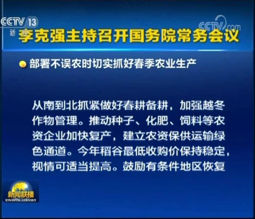 总理表示,虽然全国大规模春耕在3月,但南方地区2月底就开始了,春播粮食面积占全年的一半以上,一旦错失时机就补不回来,将会影响全年经济基础和社会稳定。