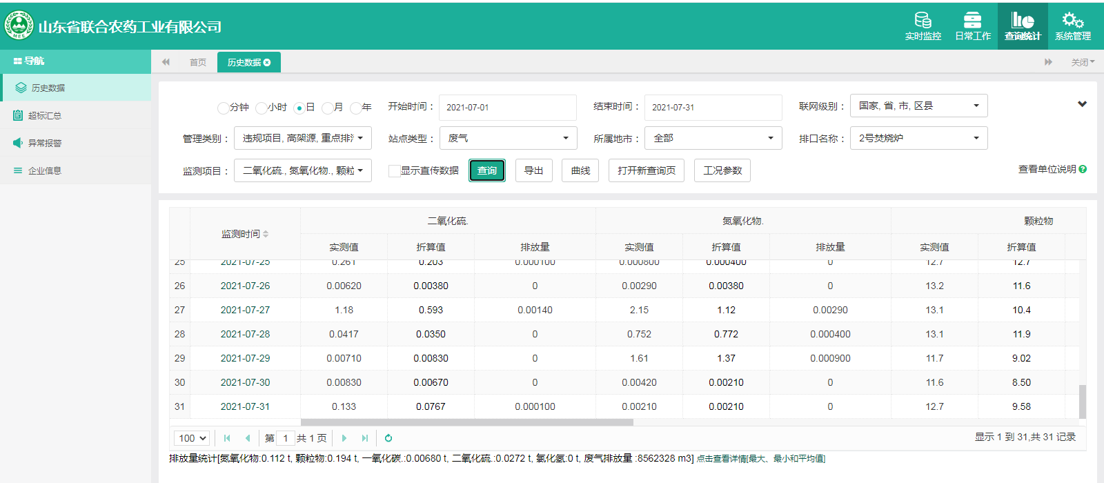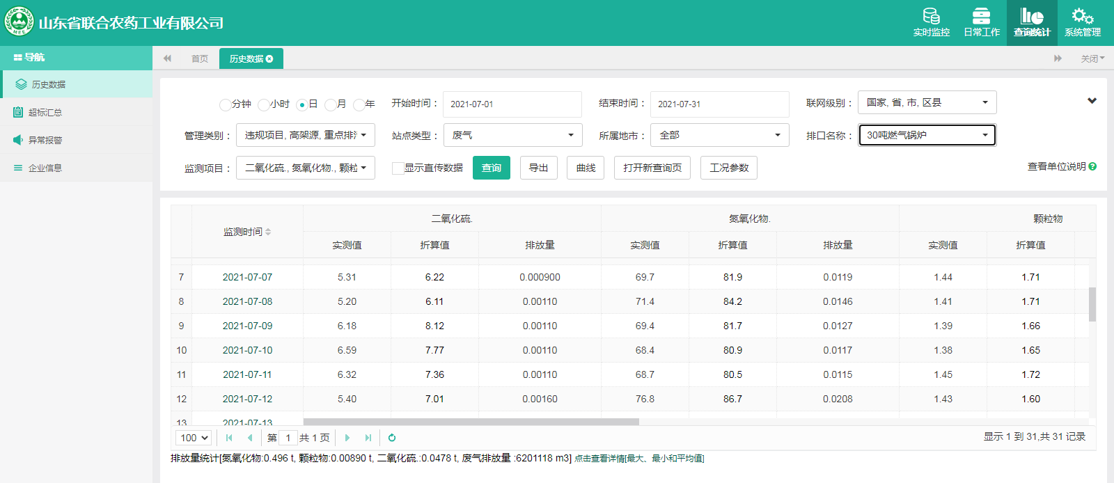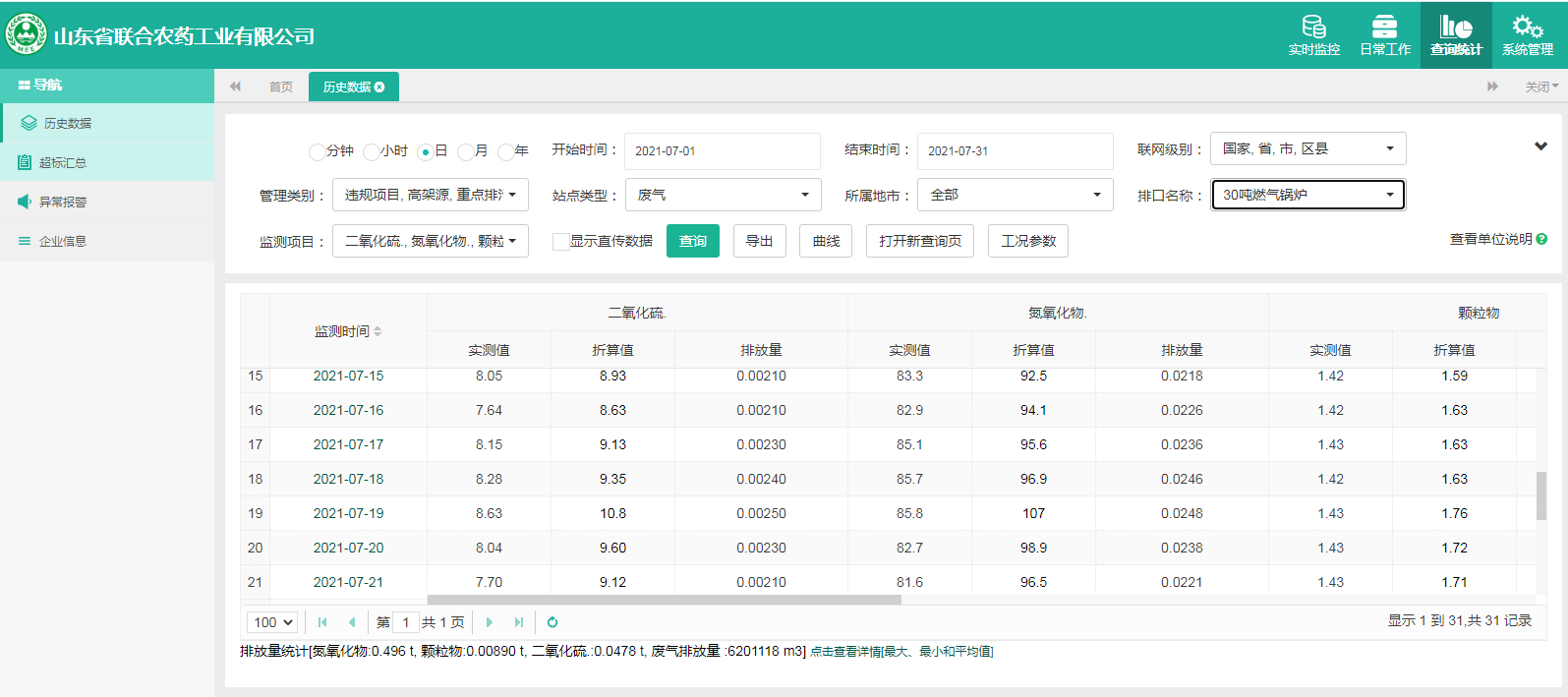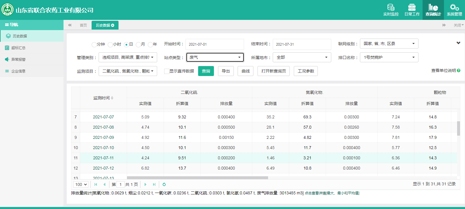 主要污染物包括COD、氨氮、二氧化硫,氮氧化物、烟尘、氯化氢、一氧化碳。其中废水中的COD、氨氮经厂区内污水处理设施处理达标排放,污水排放口污染因子COD、氨氮符合《流域水污染物综合排放标准 第1部分南四湖东平湖流域》(DB37/3416.1-2018)一般保护区标准,COD低于60mg/l,氨氮低于10mg/l。锅炉废气、导热油炉废气通过废气处理设施处理后经过烟囱高空排放,排放的烟气符合《山东省锅炉大气污染物综合排放标准(DB37/2374-2018)表2一般控制区及《区域性大气污染物综合排放标准》(GB37/2376-2019),SO2低于50 mg/m³,NOx低于200 mg/m³,烟尘低于10 mg/m³。焚烧炉废气通过废气处理设施处理后经过烟囱高空排放,排放的烟气符合《农药制造工业大气污染物排放标准》(GB39727-2020)表1、表2标准、《危险废物焚烧污染控制标准》(GB18484-2001)表3及《区域性大气污染物综合排放标准》(GB37/2376-2019)表2一般控制区标准,SO2低于100 mg/m³,NOx低于200 mg/m³,烟尘低于20 mg/m³,HCL低于60 mg/m³,一氧化碳低于80mg/m³。有组织废气排放符合《挥发性有机物排放标准 第6部分:有机化工行业》(DB37/2801.6-2018)表1标准,《农药制造工业大气污染物排放标准》(GB39727-2020)表1、表2标准、即甲醇低于50mg/m³,甲苯低于5mg/m³, VOCs低于60mg/m³。