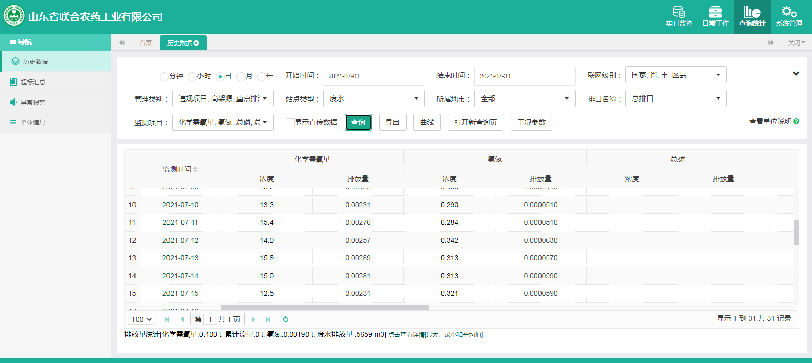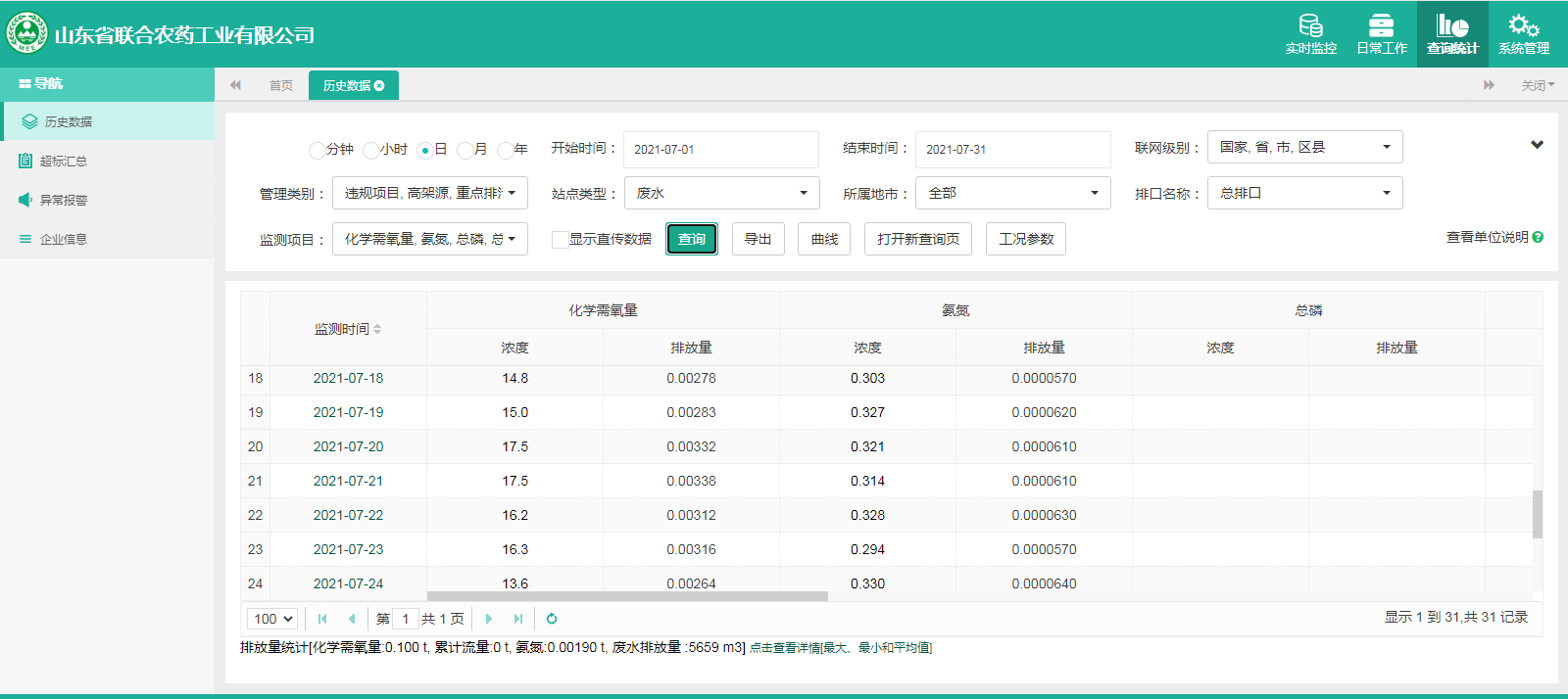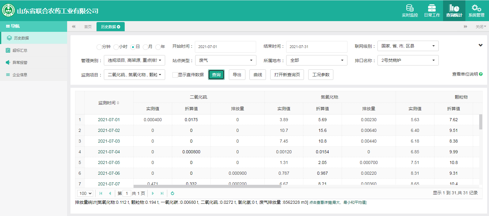 主要污染物包括COD、氨氮、二氧化硫,氮氧化物、烟尘、氯化氢、一氧化碳。其中废水中的COD、氨氮经厂区内污水处理设施处理达标排放,污水排放口污染因子COD、氨氮符合《流域水污染物综合排放标准 第1部分南四湖东平湖流域》(DB37/3416.1-2018)一般保护区标准,COD低于60mg/l,氨氮低于10mg/l。锅炉废气、导热油炉废气通过废气处理设施处理后经过烟囱高空排放,排放的烟气符合《山东省锅炉大气污染物综合排放标准(DB37/2374-2018)表2一般控制区及《区域性大气污染物综合排放标准》(GB37/2376-2019),SO2低于50 mg/m³,NOx低于200 mg/m³,烟尘低于10 mg/m³。焚烧炉废气通过废气处理设施处理后经过烟囱高空排放,排放的烟气符合《农药制造工业大气污染物排放标准》(GB39727-2020)表1、表2标准、《危险废物焚烧污染控制标准》(GB18484-2001)表3及《区域性大气污染物综合排放标准》(GB37/2376-2019)表2一般控制区标准,SO2低于100 mg/m³,NOx低于200 mg/m³,烟尘低于20 mg/m³,HCL低于60 mg/m³,一氧化碳低于80mg/m³。有组织废气排放符合《挥发性有机物排放标准 第6部分:有机化工行业》(DB37/2801.6-2018)表1标准,《农药制造工业大气污染物排放标准》(GB39727-2020)表1、表2标准、即甲醇低于50mg/m³,甲苯低于5mg/m³, VOCs低于60mg/m³。