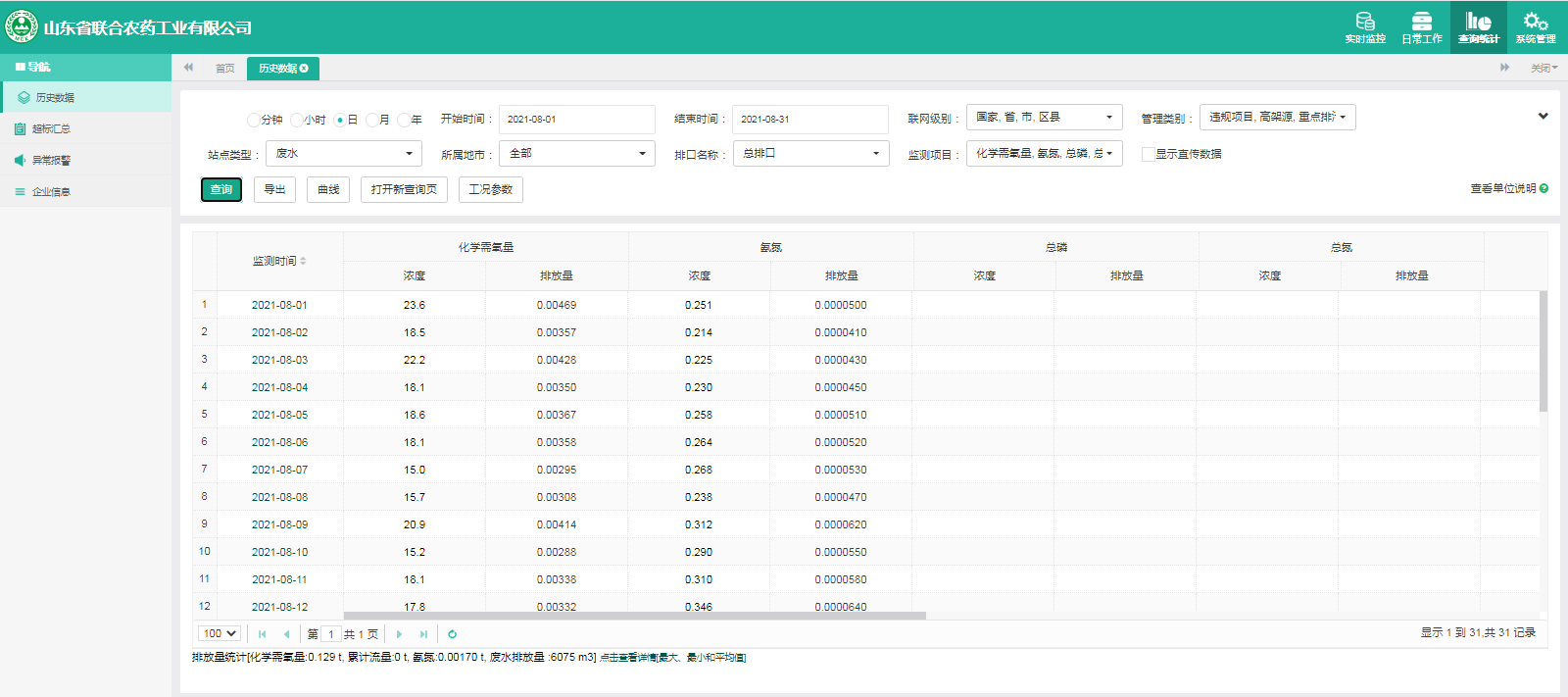 主要污染物包括COD、氨氮、二氧化硫,氮氧化物、烟尘、氯化氢、一氧化碳。其中废水中的COD、氨氮经厂区内污水处理设施处理达标排放,污水排放口污染因子COD、氨氮符合《流域水污染物综合排放标准 第1部分南四湖东平湖流域》(DB37/3416.1-2018)一般保护区标准,COD低于60mg/l,氨氮低于10mg/l。锅炉废气、导热油炉废气通过废气处理设施处理后经过烟囱高空排放,排放的烟气符合《山东省锅炉大气污染物综合排放标准(DB37/2374-2018)表2一般控制区及《区域性大气污染物综合排放标准》(GB37/2376-2019),SO2低于50 mg/m³,NOx低于200 mg/m³,烟尘低于10 mg/m³。焚烧炉废气通过废气处理设施处理后经过烟囱高空排放,排放的烟气符合《农药制造工业大气污染物排放标准》(GB39727-2020)表1、表2标准、《危险废物焚烧污染控制标准》(GB18484-2001)表3及《区域性大气污染物综合排放标准》(GB37/2376-2019)表2一般控制区标准,SO2低于100 mg/m³,NOx低于200 mg/m³,烟尘低于20 mg/m³,HCL低于60 mg/m³,一氧化碳低于80mg/m³。有组织废气排放符合《挥发性有机物排放标准 第6部分:有机化工行业》(DB37/2801.6-2018)表1标准,《农药制造工业大气污染物排放标准》(GB39727-2020)表1、表2标准、即甲醇低于50mg/m³,甲苯低于5mg/m³, VOCs低于60mg/m³。
