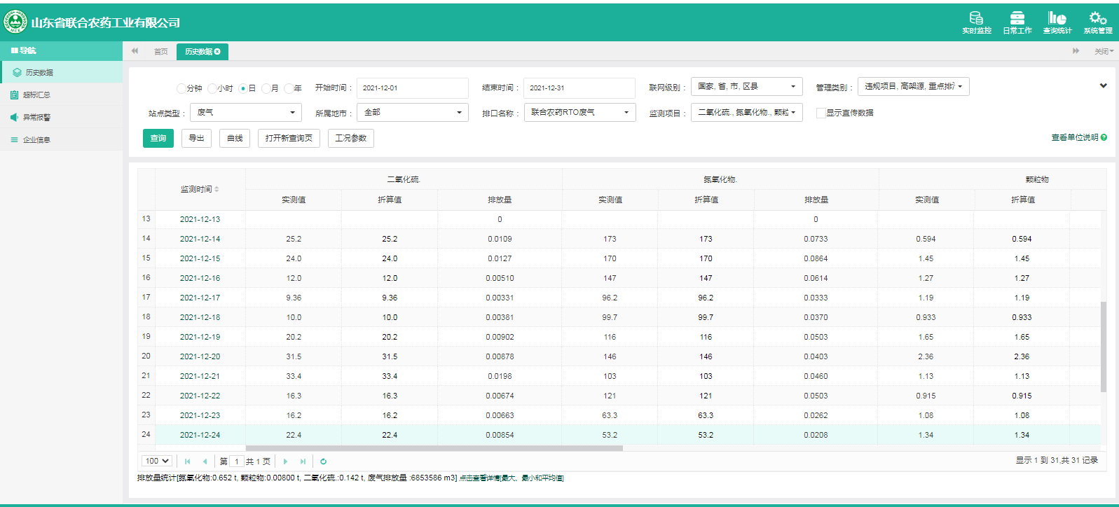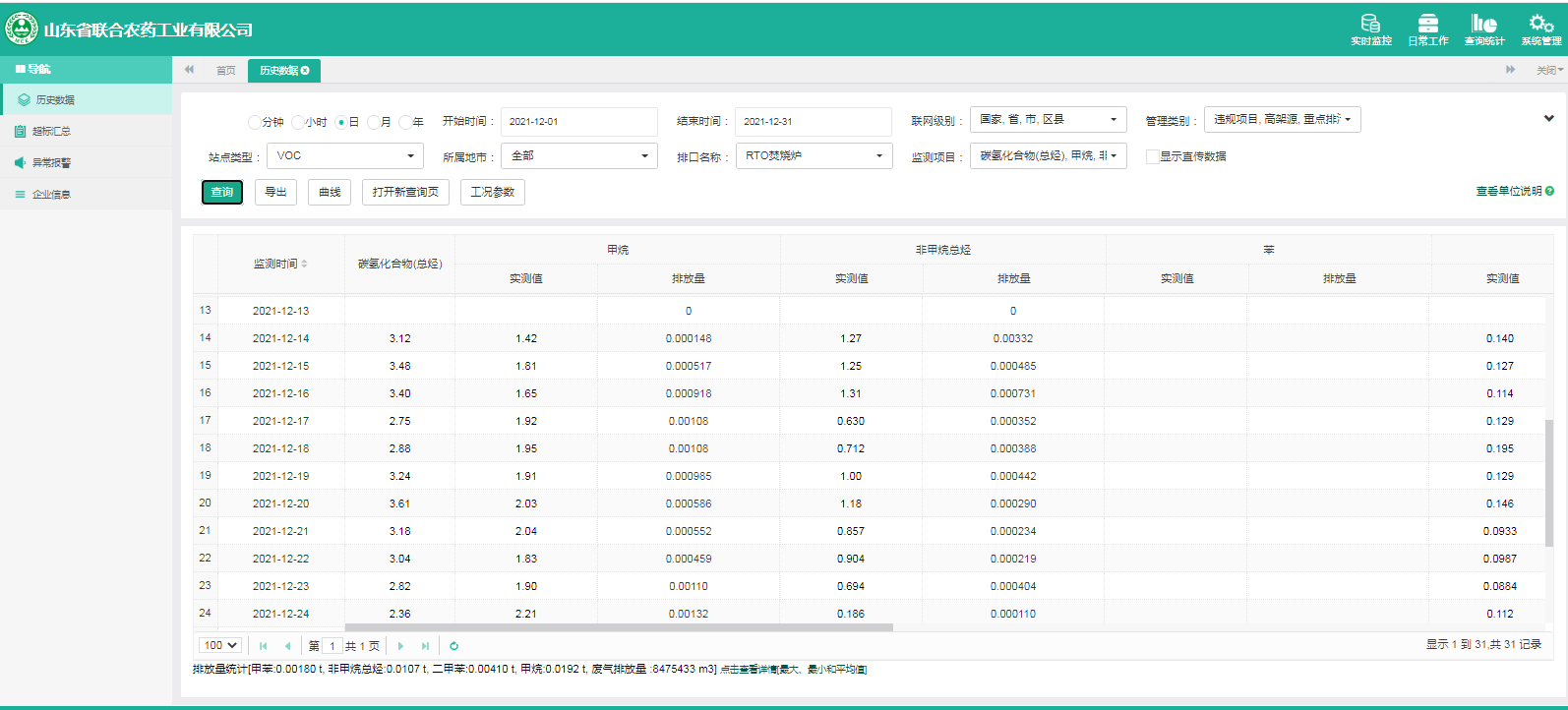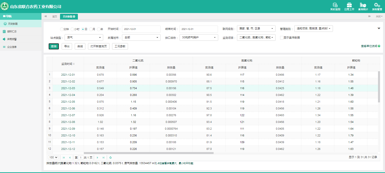 主要污染物包括COD、氨氮、二氧化硫,氮氧化物、烟尘、氯化氢、一氧化碳。其中废水中的COD、氨氮经厂区内污水处理设施处理达标排放,污水排放口污染因子COD、氨氮符合《流域水污染物综合排放标准 第1部分南四湖东平湖流域》(DB37/3416.1-2018)一般保护区标准,COD低于60mg/l,氨氮低于10mg/l。锅炉废气、导热油炉废气通过废气处理设施处理后经过烟囱高空排放,排放的烟气符合《山东省锅炉大气污染物综合排放标准(DB37/2374-2018)表2一般控制区及《区域性大气污染物综合排放标准》(GB37/2376-2019),SO2低于50 mg/m³,NOx低于200 mg/m³,烟尘低于10 mg/m³。焚烧炉废气通过废气处理设施处理后经过烟囱高空排放,排放的烟气符合《农药制造工业大气污染物排放标准》(GB39727-2020)表1、表2标准、《危险废物焚烧污染控制标准》(GB18484-2001)表3及《区域性大气污染物综合排放标准》(GB37/2376-2019)表2一般控制区标准,SO2低于100 mg/m³,NOx低于200 mg/m³,烟尘低于20 mg/m³,HCL低于60 mg/m³,一氧化碳低于80mg/m³。有组织废气排放符合《挥发性有机物排放标准 第6部分:有机化工行业》(DB37/2801.6-2018)表1标准,《农药制造工业大气污染物排放标准》(GB39727-2020)表1、表2标准、即甲醇低于50mg/m³,甲苯低于5mg/m³, VOCs低于60mg/m³。